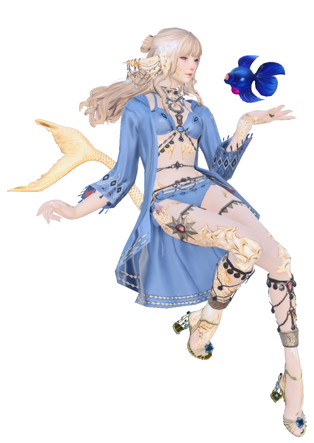 notable features Her tail is covered in cycloid scales but ends in a fluke, like a porpoise. She has cream-coloured scales with a dusting of gold, and the scales on her ribs can flare out to reveal a set of gills.